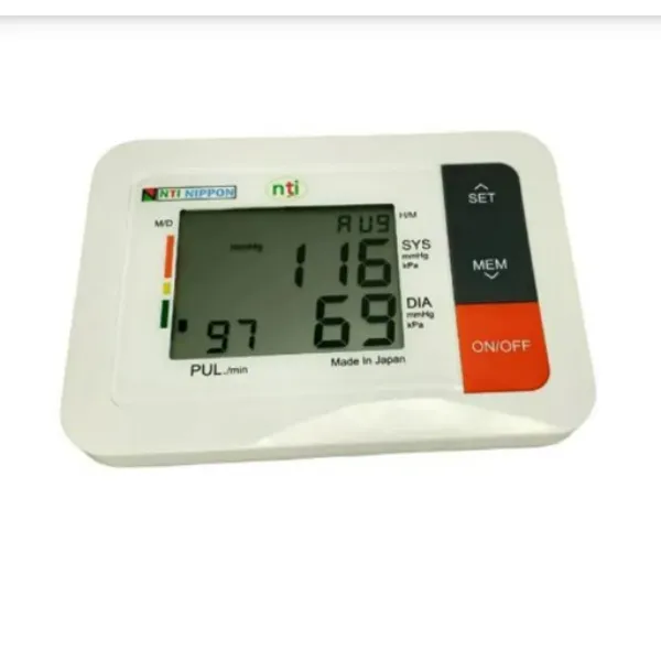 The NTI digital blood pressure monitor (BPUA200) from Japan features Intelligent Automatic measurement, a WHO classification indicator, a clear light button, a large and clear LCD display, memory that can save 90 days of data, and a date/time function display.
