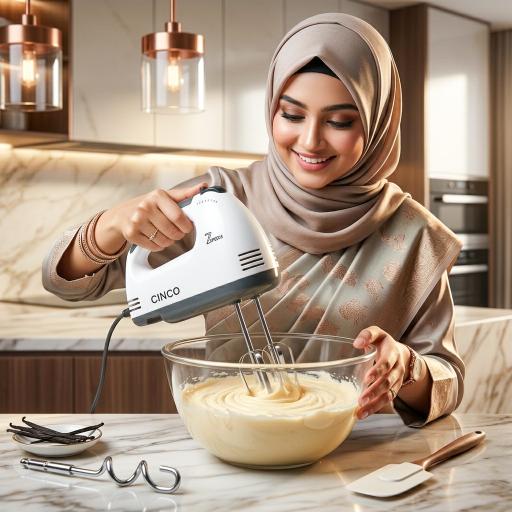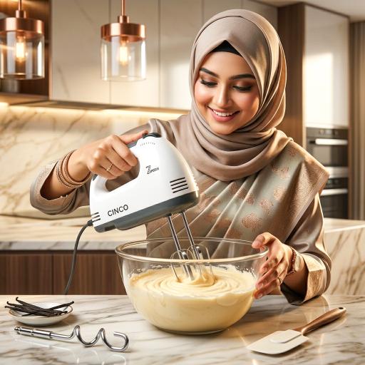 The thumb-operated control and safety interlock system ensure convenient and safe operation. Its lightweight design and easy accessory release button allow quick cleaning and comfortable handling. Whether you are baking cakes, preparing desserts, or mixing ingredients, the Cinco hand mixer is a reliable tool for every kitchen.