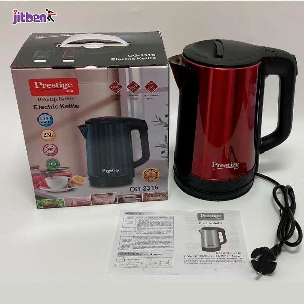 Experience convenience and style with the Prestige Electric Kettle OG-2316. This electric kettle boasts a generous capacity of 2.3 liters, making it ideal for brewing large quantities of tea, coffee, or preparing instant meals. Featuring a 360° rotatable base, the prestige og 2316 electric kettle offers easy pouring from any angle, ensuring a hassle-free experience. Crafted with high-quality materials, the Prestige Electric Kettle is built for durability and efficiency. Upgrade your kitchen with this reliable appliance today!